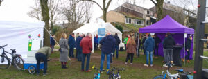 Bij de opening van het programma deed ook wethouder Fenneke van der Vegte een enthousiast woordje (rechter groene jas…) Zo’n vijftig bewoners bezochten in de loop van de middag het programma en deden mee aan verschillende dating-rondes.