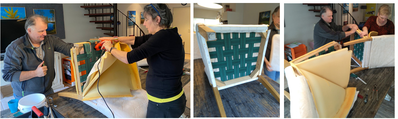 Deze week zijn Ben en Gonnie Epskamp en Sandra Bosman al een dagje bezig geweest met het verbeteren van de stoelzittingen. Hoezen ook meteen maar even gewassen.