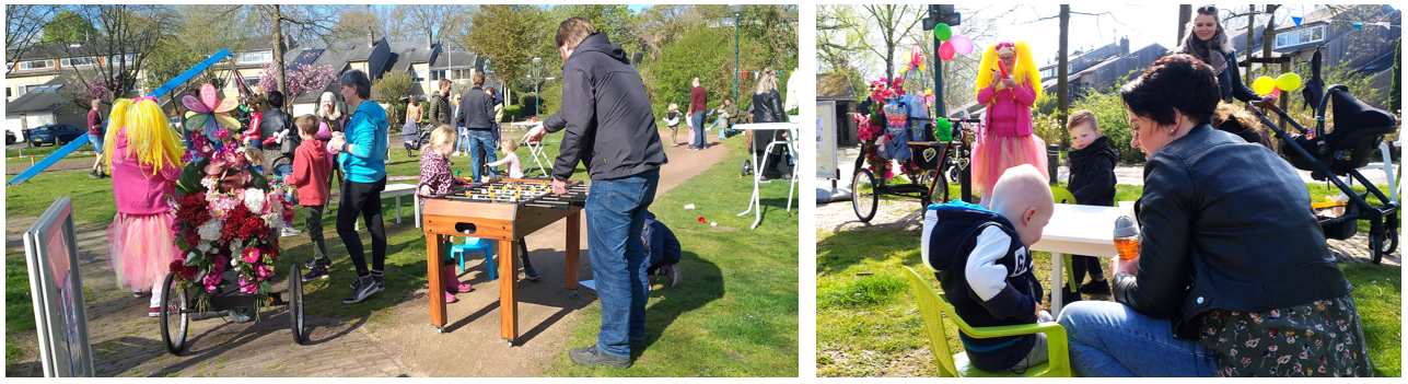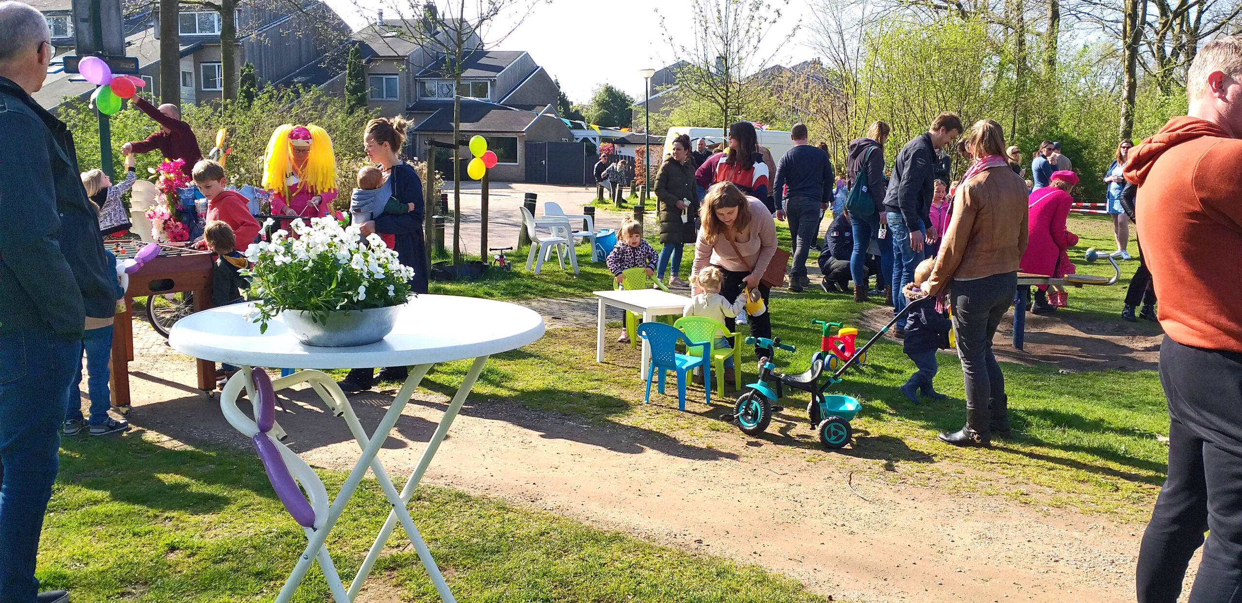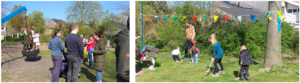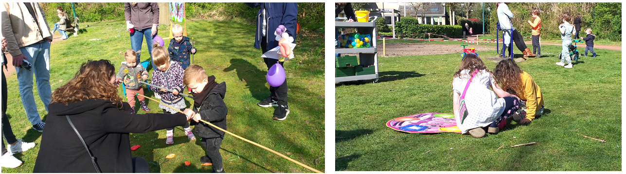 Na het eieren zoeken werd er heerlijk gespeeld met allerlei speelgoed en de speeltoestellen op het veld. Zelfs Miss T’ie was aanwezig van Haagsche Bluf ballon (en buurvrouw van de Kokmeeuw). Iedereen greep de kans aan om nieuwe mensen te leren kennen en andere ouders te ontmoeten met kinderen in dezelfde leeftijd.