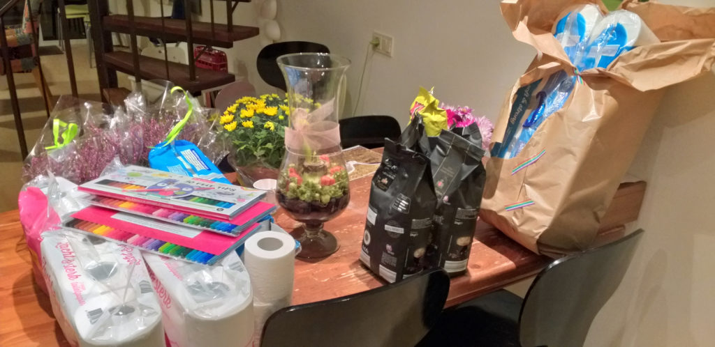 Naast een heleboel lieve buren ontvingen we meer: felicitaties en bloemen van Lariks en onze collega-buurtverenigingen DAVA en Leusden-ZET. Maar ook een ‘Bezoekersboek’ van Tineke van den Berg , stiften van de Diaconie PgL en héél veel wc-papier en koffiebonen (essentiële zaken). Tenslotte maakte AMVEST nog een ruim gebaar: een waardebon voor een maand gratis huur!