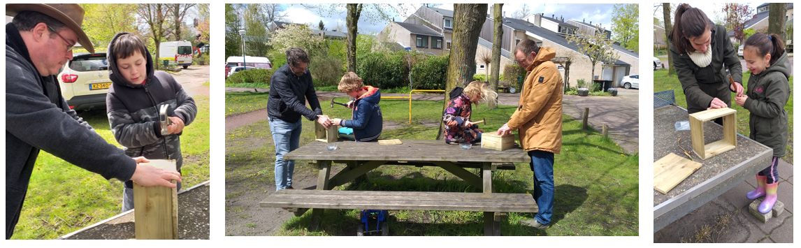 Afgelopen woensdag 5 mei hebben 13 kinderen met een vader, moeder of opa én veel plezier gewerkt aan een insectenhotel. De hotels hangen inmiddels in de tuinen, verspreid door de wijk op zonnige plekjes. Harrie Zwanenburg had geweldig voorwerk verricht met het zagen van plankjes en stengels op maat. Ook kon er gewerkt worden met dennenappels, stro, schors en klei. Hoogtepunt was voor een aantal kinderen waarschijnlijk dat ze zelf met de boor aan de slag mochten. Onder deskundige leiding van Harrie van der Sanden en Fleur natuurlijk.